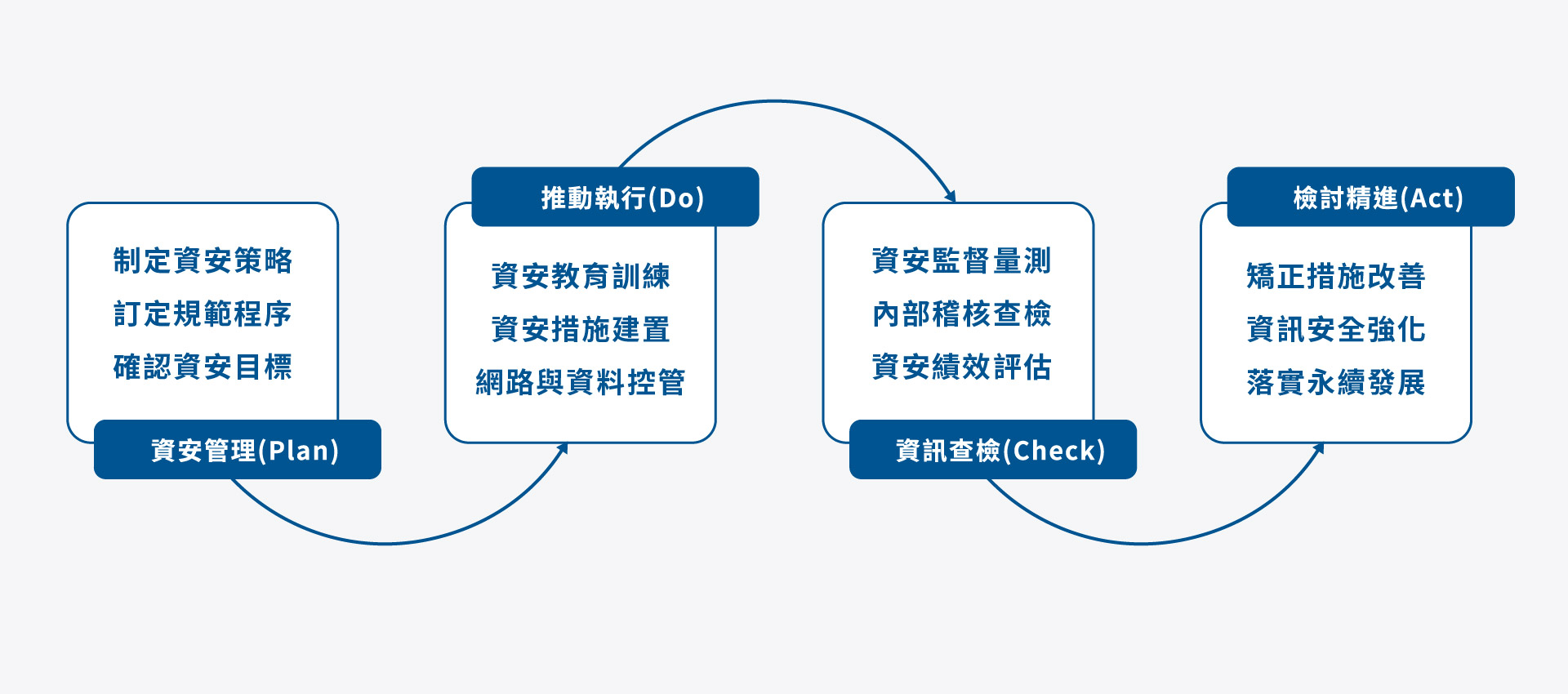 本公司執行ISMS管理系統所需達成之安全目標,依據資通安全管理目標之相關程序書之規定辦理,依據PDCA(Plan-Do-Check-Act)循環式架構,確保各項目標之達成及持續改善。