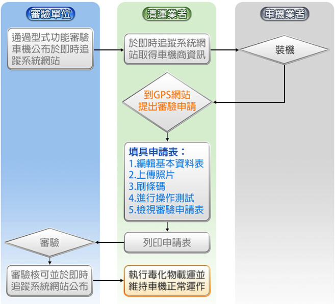 正式審驗通過後,必須依GPS公告規定執行「軌跡確認」作業。須由清運業者每週上GPS監控網站,自行進行公司運作車輛週確認。
